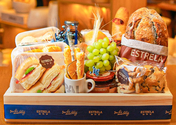 Cestas montadas com pães, frios, doces e bebidas selecionadas, perfeitas para presentear ou começar o dia de forma especial.